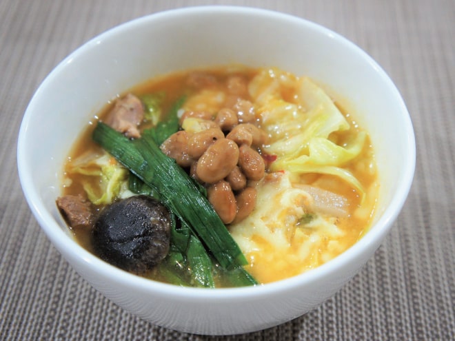 納豆(丹念納豆)、キャベツ、白菜、椎茸、えのき、ニラ、香味シャンタン、キムチ、キムチの素、ご飯、チーズ