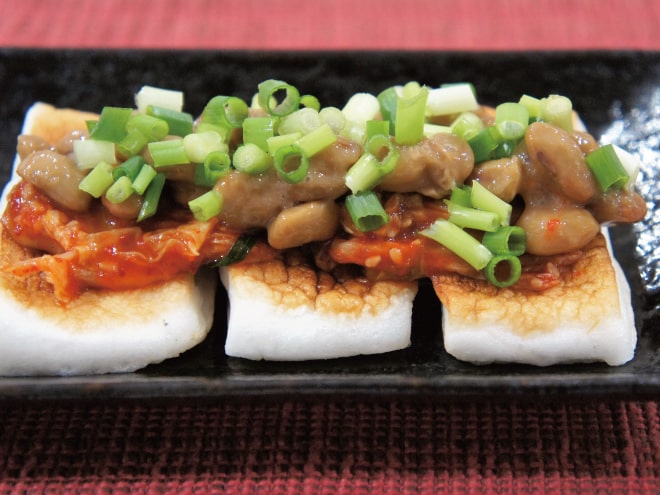 焼きはんぺんの納豆キムチのせ