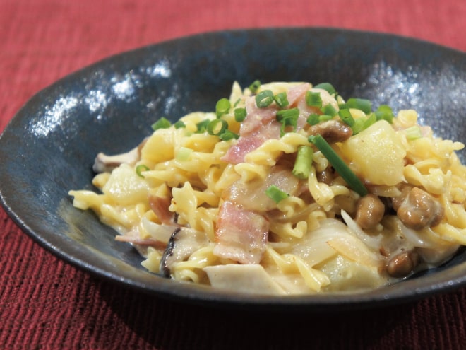 納豆とマカロニとじゃがいものカルボナーラ