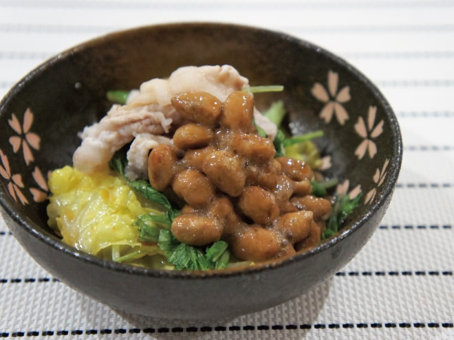 ④器に白菜、豚バラ肉、水菜、納豆を盛りつけポン酢をかけたら完成です。