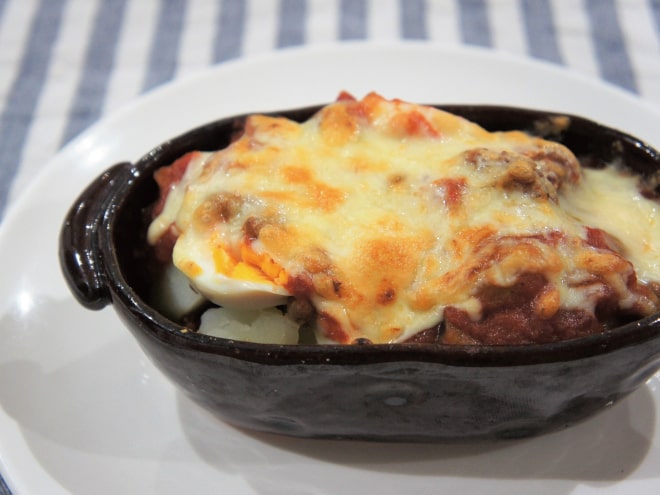 ⑥耐熱皿に、から揚げ、じゃがいも、茹で卵をのせて③のトマトソース、納豆、とろけるチーズをかけたら、チーズを上からちらしオーブンで焼いて完成です。