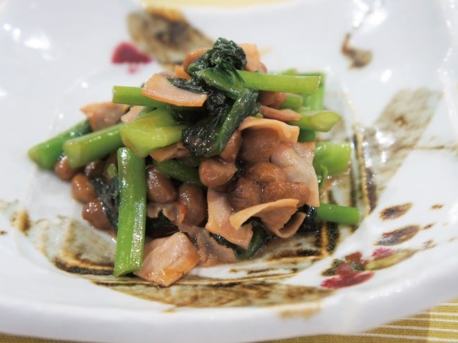 ③納豆を加え、醤油と砂糖で甘辛く味付けをしたら器に盛り付けて完成です。