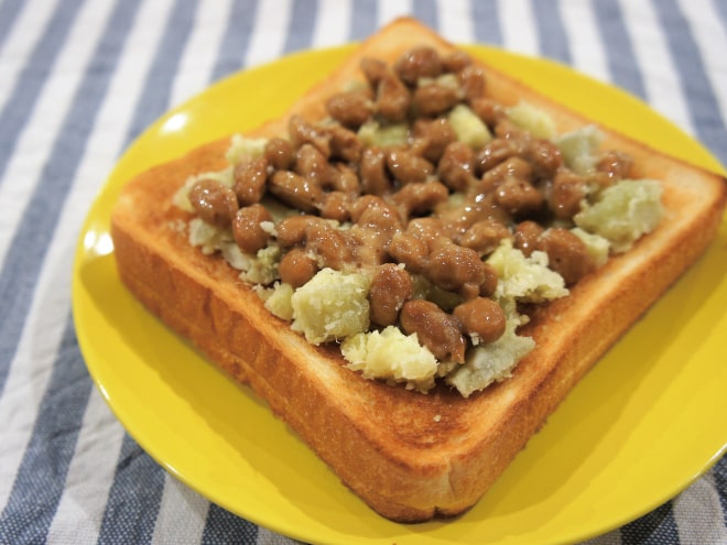 ②食パンを焼いて、その上にさつまいもと納豆をのせたら完成です。