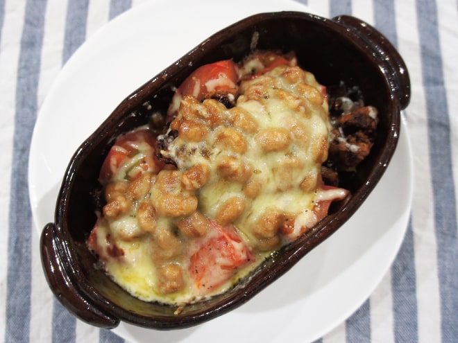 ④最後に、納豆とチーズを入れたらオーブンでチーズがとろけるまで焼いて完成です。