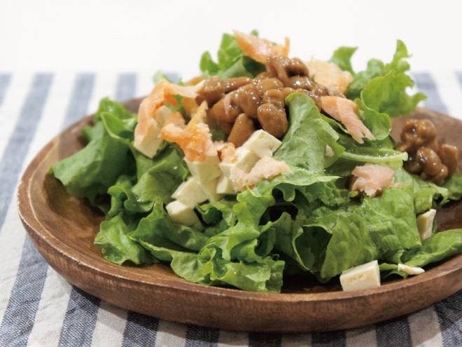④お皿に、レタス、鮭、木綿豆腐、納豆をのせてお好みのドレッシングをかけたら完成です。