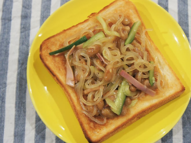 ④食パンをトーストにして、納豆春雨をのせたら完成です。