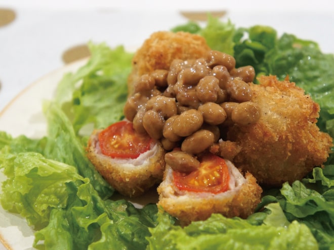 納豆(丹念納豆)、プチトマト、薄切り豚バラ肉、塩こしょう、小麦粉、パン粉、ポン酢、フリルレタス