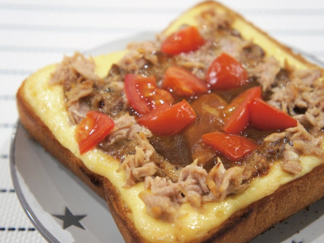⑤最後にシーチキンと切ったミニトマトをかけてオーブンで焼いたら完成です。