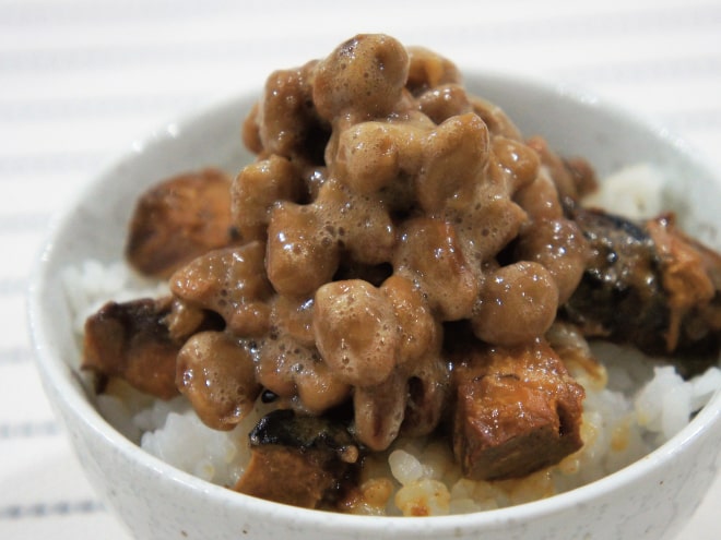 ②納豆をよく混ぜたら、サバ味噌ご飯にかけて完成です。