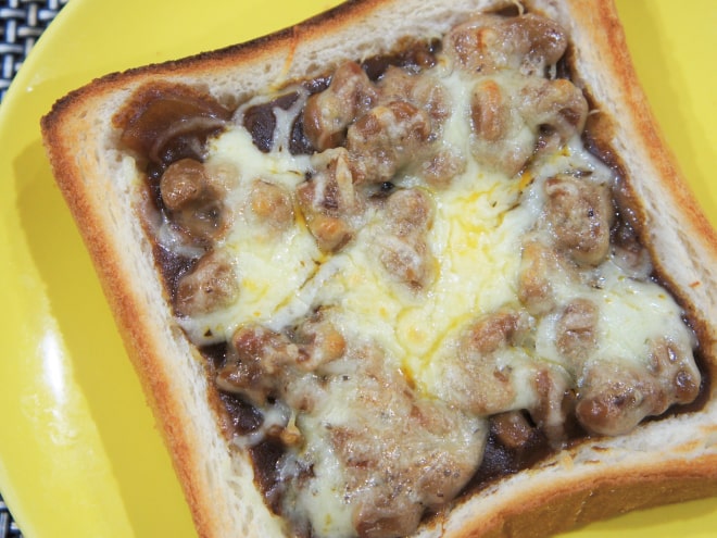⑤最後にルーを入れてとろみがつく程度に煮込んだら、食パンのくぼみにルーを入れて納豆とチーズをかけ、オーブンで焦げ目が付く程度に焼いたら完成です。