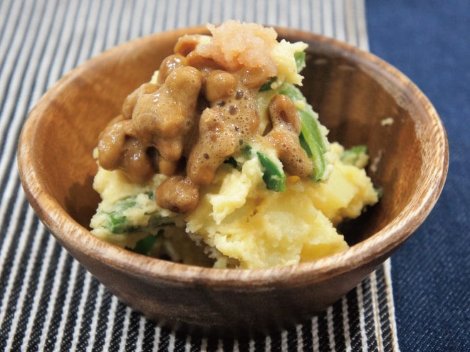 納豆(丹念納豆)、じゃがいも、明太子又はたらこ、マヨネーズ、さやえんどう