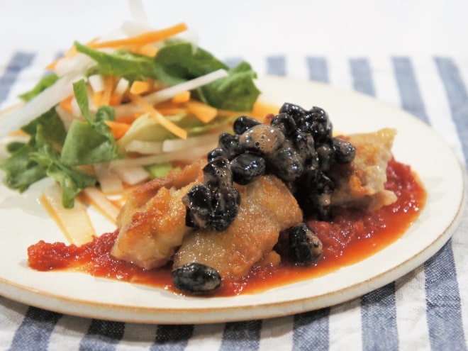 ⑤お皿に、千切りにしたサニーレタス、にんじん、大根を添え、トマトソースをひいて焼いたチキンをのせたら納豆をかけて完成です。