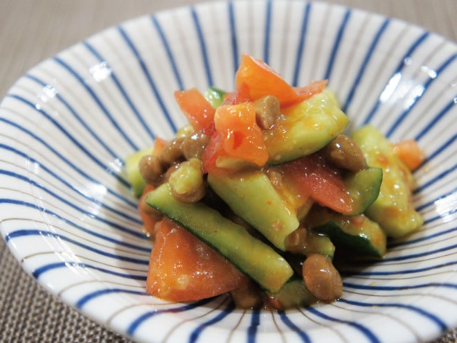 納豆(丹念納豆)、きゅうり、プチトマト、豆板醤、ラー油