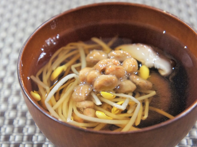 ③茹でた大豆もやしを加えて、ひと煮たちさせたら器に盛り付け納豆をのせたら完成です。
