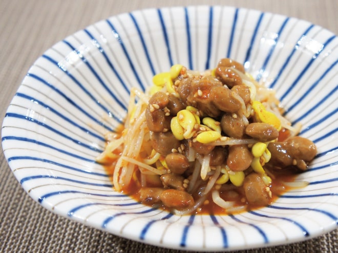 ②ボールに、①の大豆もやしを入れたらキムチの素で和えて納豆を加えます。