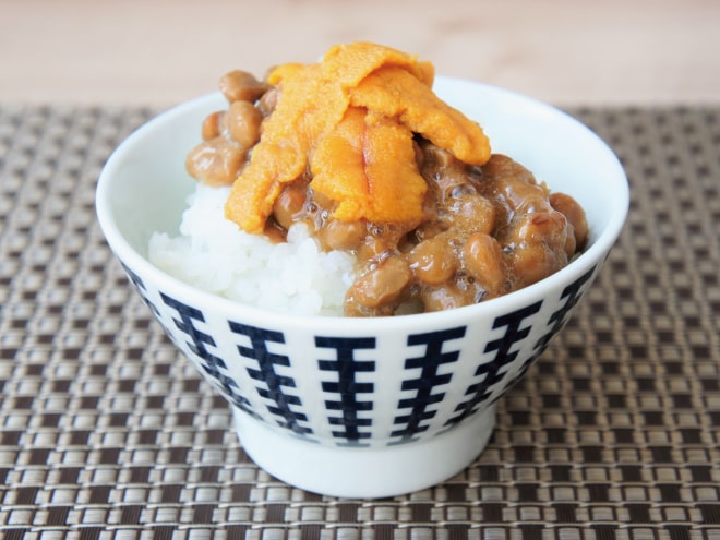 ②お茶碗にご飯をついだら納豆、うにをかけて完成です。