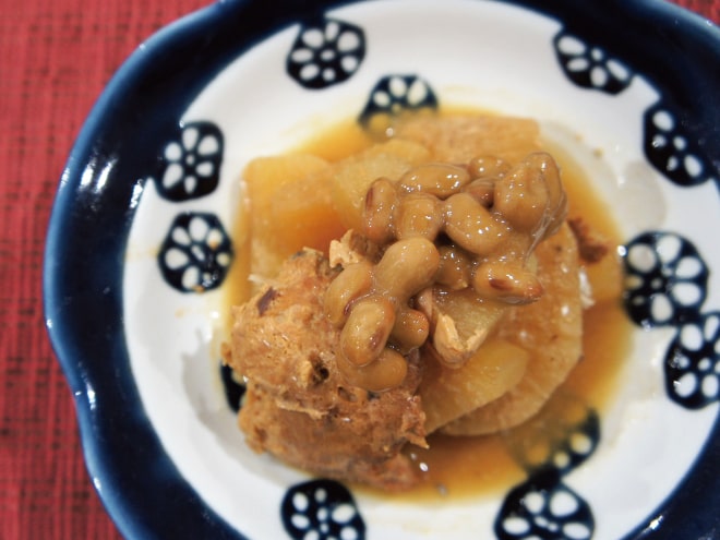 ③十分に大根に味が染み込んだら、器に盛り付けて納豆をかけたら完成です。