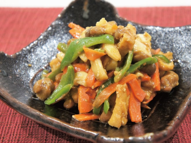 納豆(丹念納豆)、厚揚げ、ピーマン、にんじん、しめじ、味噌、醤油、砂糖、酒、ごま、ごま油