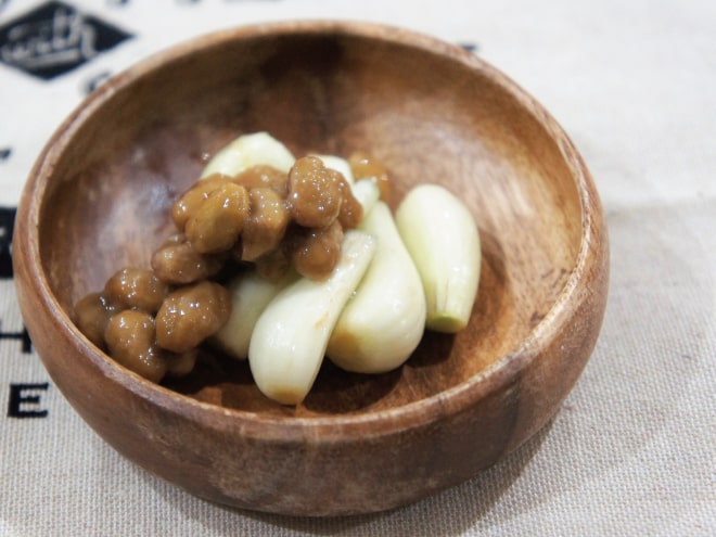 ②らっきょに味がよく染み込んだら、器に盛り付けて納豆をかけて完成です。