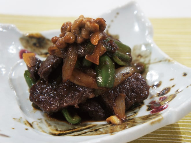 納豆(丹念納豆)、牛もも焼肉、ピーマン、玉ねぎ、焼き肉のたれ