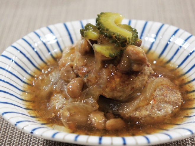 ④薄切りにしたゴーヤを③に入れたら、器にハンバーグを盛りつけ、あんをかけたら完成です。