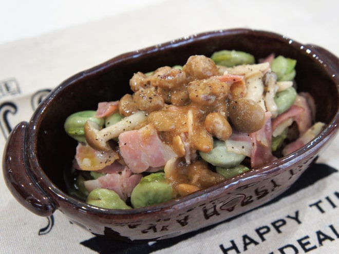 納豆(丹念納豆)、いんげん豆、しめじ、ベーコン、にんにく、塩、オリーブオイル