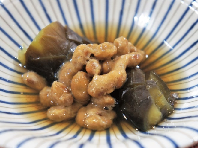 納豆(丹念納豆)、茄子、茅野屋のだし、濃口醤油