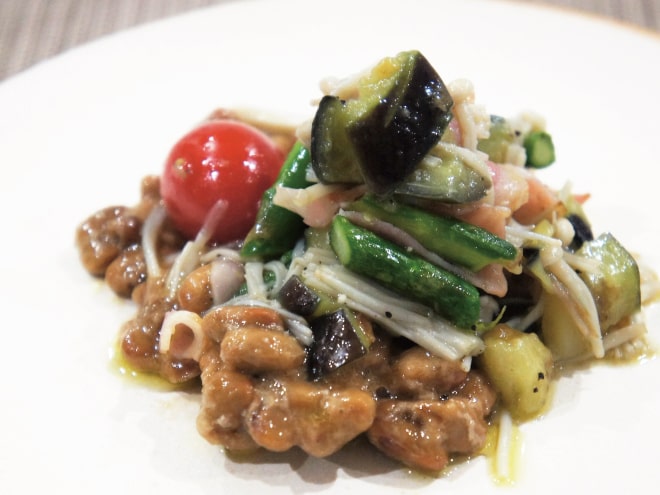 納豆(丹念納豆)、茄子、アスパラ、しめじ、えのき、ベーコン、プチトマト、にんにく、塩、オリーブオイル