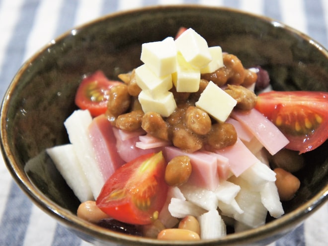 納豆(丹念納豆)、やまいも、プチトマト、ハム、ゆで豆、プロセスチーズ、ポン酢、ごま油