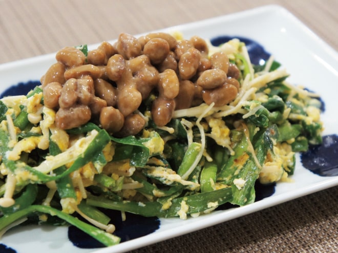 納豆(丹念納豆)、ニラ、エノキ、卵、だし醤油、塩胡椒