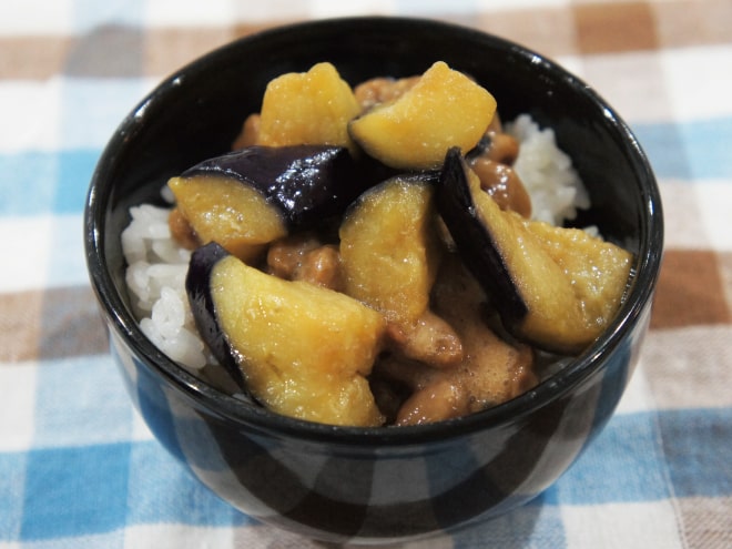 ④お茶碗にご飯を盛って、納豆と③のナスをかけたら完成です。