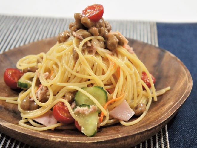 納豆(丹念納豆)、シーチキン、きゅうり、玉ねぎ、にんじん、プチトマト、ハム、パスタ麺、麺つゆ、ポン酢、ごま油、塩