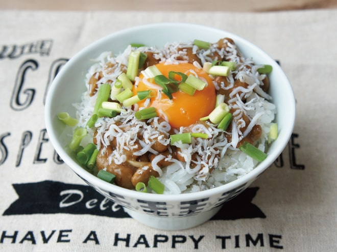 納豆(丹念納豆)、卵、じゃこ、ねぎ、ご飯