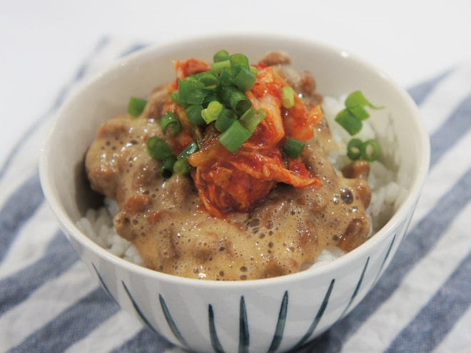 ②ご飯をついだら納豆、キムチ、ねぎをかけて完成です。
