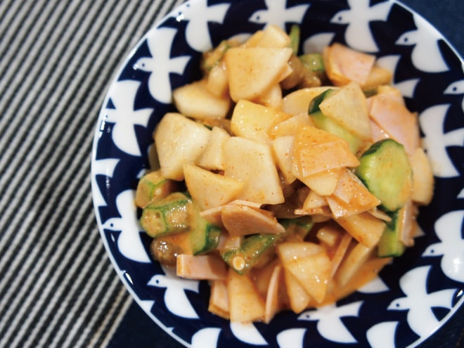 納豆(丹念納豆)、大根、きゅうり、オクラ、ハム、塩、キムチの素、マヨネーズ