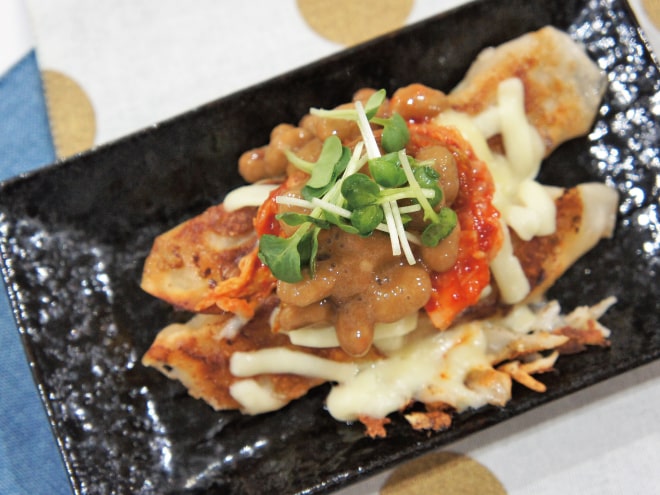 納豆(丹念納豆)、市販の餃子、キムチ、とろけるチーズ、かいわれ大根