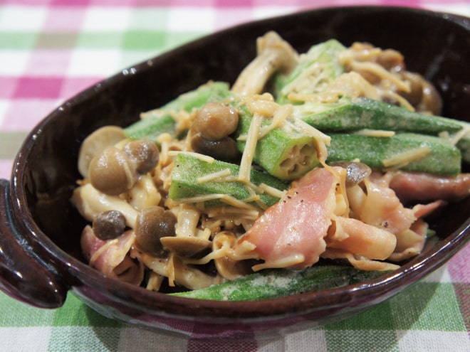 納豆(丹念納豆)、オクラ、しめじ、えのき、ベーコン、マヨネーズ、醤油、粗びき塩コショウ