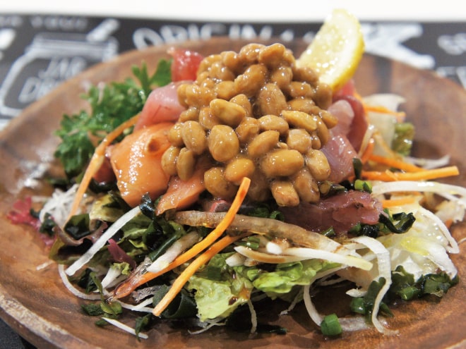 納豆(丹念納豆)、サーモン、マグロ、鯛、大根、にんじん、玉ねぎ、フリルレタス、海藻、レモン、バルサミコ酢、粗びき塩コショウ、オリーブオイル
