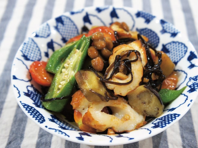 納豆(丹念納豆)、茄子、オクラ、プチトマト、ちくわ、塩昆布、オリーブオイル、にんにく