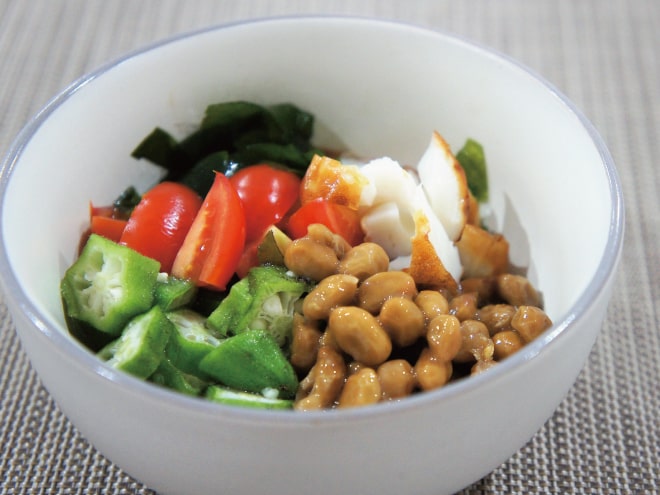 納豆(丹念納豆)、生わかめ、オクラ、プチトマト、ちくわ