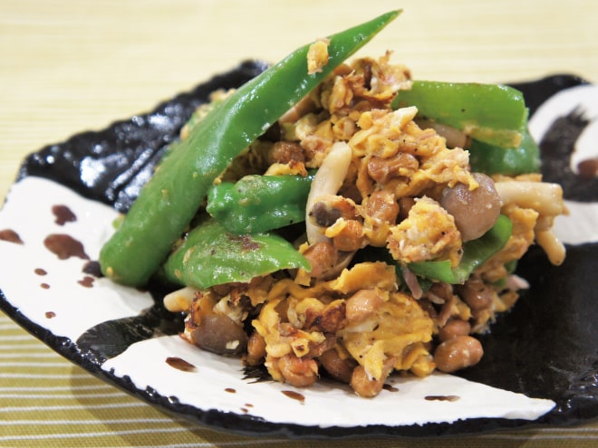 ⑤卵を加えて更に炒めたら、納豆、中華ダシの素、粗びき塩コショウ、醤油少々で味を調えたら器に盛り付けて完成です。