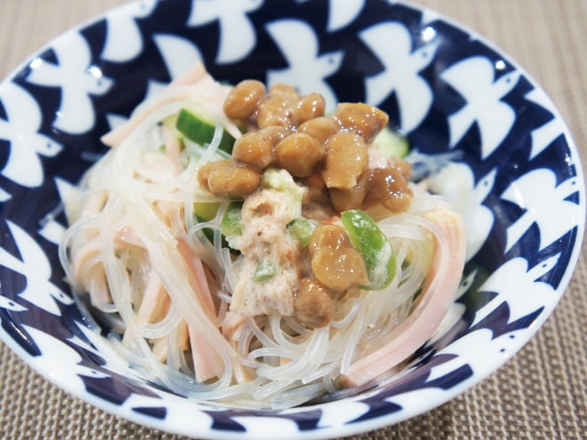 納豆(丹念納豆)、春雨、きゅうり、ハム、シーチキン、ピーマン、マヨネーズ、にんじん、粗びき塩コショウ、酢、醤油、砂糖