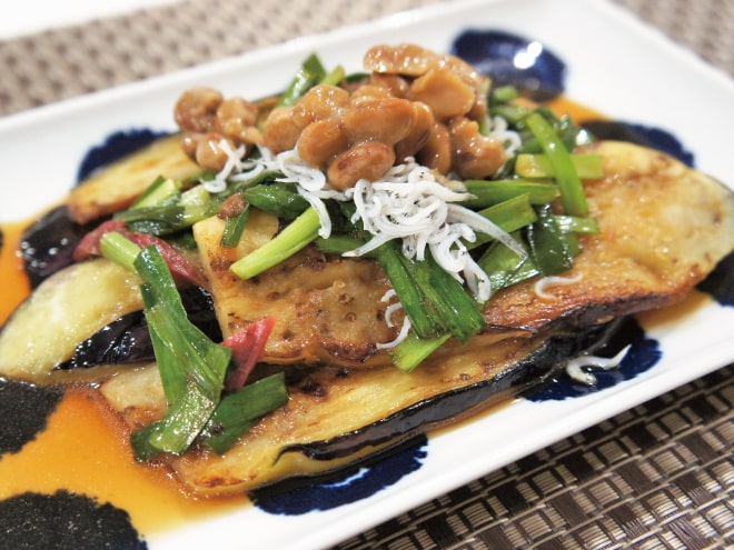 茄子と梅じゃこ納豆ニラソース|納豆を使用した簡単料理、レシピ・作り方を紹介