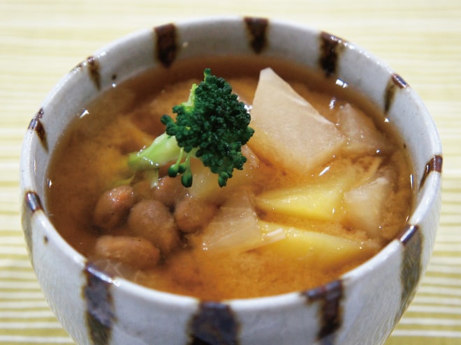 納豆(丹念納豆)、サツマイモ、大根、えのき、ブロッコリー、煮干し、味噌