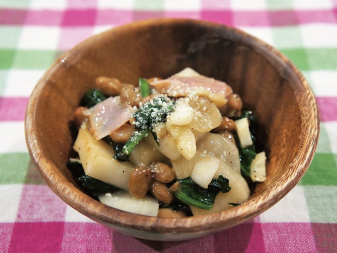 納豆(丹念納豆)、かぶ、ほうれん草、ベーコン、塩、粉チーズ