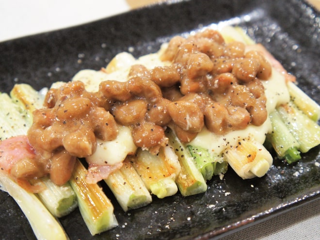 納豆(丹念納豆)、白ネギ、ベーコン、とろけるチーズ、粗びき塩コショウ