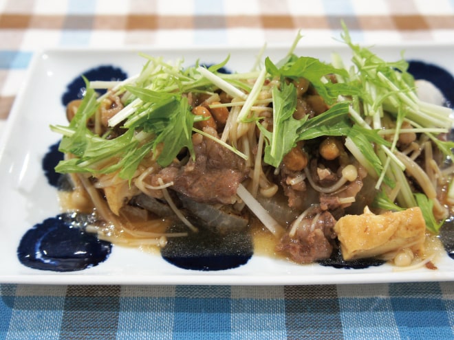 納豆(丹念納豆)、牛バラ薄切り肉、厚揚げ、大根、椎茸、えのき、水菜、醤油、だしの素、酒、片栗粉