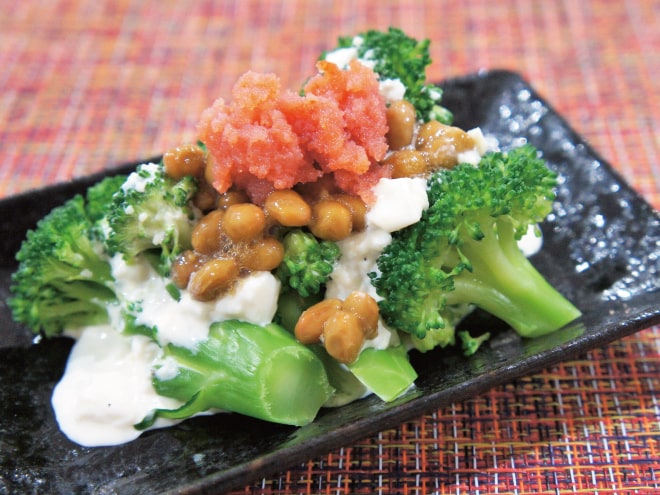 ③器にブロッコリーを盛りつけたら、②のソース、納豆、明太子をかけて完成です。