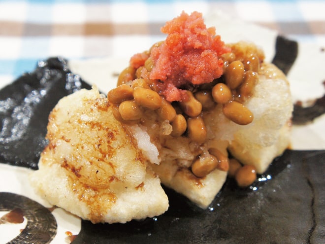 ③器に揚げた餅をのせたら、大根おろし、納豆、明太子をのせて醤油をかけたら完成です。