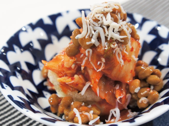④器に揚げ餅を盛り付けて納豆、キムチ、ちりめんをかけたら完成です。